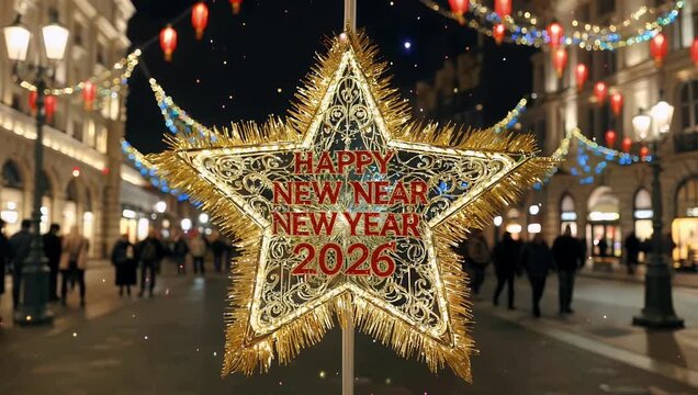A celebratory graphic design, featuring a Happy New Year 2026 message