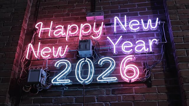 Neon composition features the 2026 Chinese New Year in bold glowing lines with a warm horse symbol at the center. The design blends light and color to create a lively celebratory look.