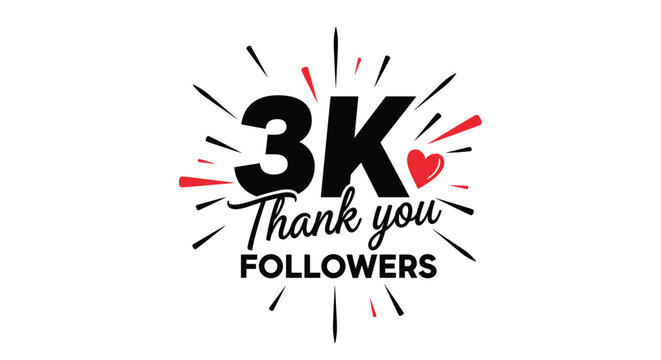 A celebratory graphic for social media announcing '3K Thank you Followers' with a heart icon and festive explosion lines and details.