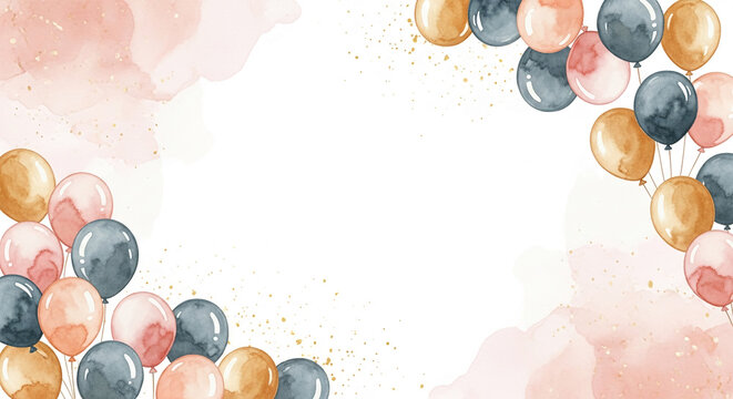 Watercolor balloons in pink, gold, and gray hues frame a white background, speckled with gold glitter, creating a festive and celebratory design ideal for invitations or announcements
