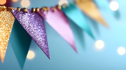 Festive glittery party bunting flags in gold, purple and pink against blurred turquoise background with bokeh lights creating celebratory atmosphere.