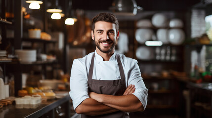 Capture the essence of a celebrity chef facing challenges headon in a dynamic frontal view Show determination and grit in their expression