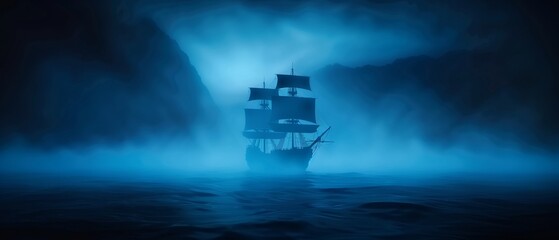 Concept of a ghostly haunted ship, spectral sailors and eerie fog, haunting and atmospheric scene