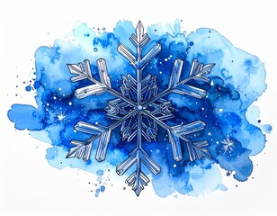 Ilustración estilo dibujo de un copo de nieve con líneas negras finas, sobre un splash de acuarela azul celeste