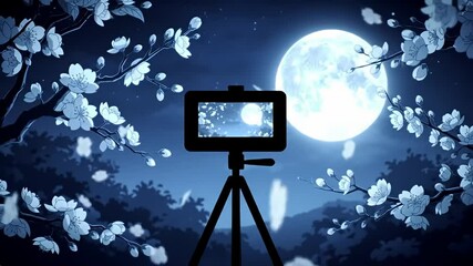 Silhouetted camera records moonlit cherry blossoms against a cool blue night backdrop