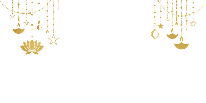 Luxury Golden Diwali Hanging Ornaments Vector Background - Stars, Lotus, and Diya Lamps on Dark Blue Background