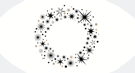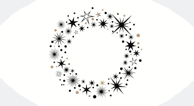 A festive wreath of black and gold stars isolated on white background creates a celestial and elegant design, perfect for holiday greetings and celebrations