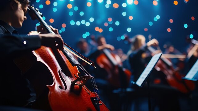 Close-up of a cellist performing at a concert, surrounded by fellow musicians, under bright stage lights.