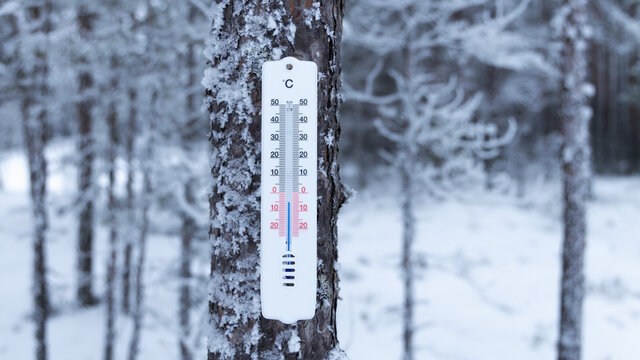 Thermometer on a background of winter forest shows 5 degrees below zero. Cold weather concept.