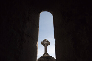 A closeup view of a Celtic Cross set against a bright, blue sky.