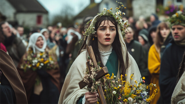 St. Brigid's Day parade in a small Irish village, people carrying St. Brigid's cross while singing and praying, wild flower decorations decorate the village streets, Ai generated images