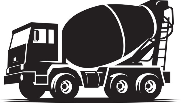 a black and white silhouette of a cement truck with a cement mixer, truck