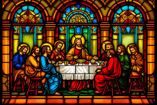 Stunning, vibrant stained-glass depiction of the Last Supper with Jesus and his apostles in a Catholic cathedral. Richly emotional, perfect for catechism education. Generative AI