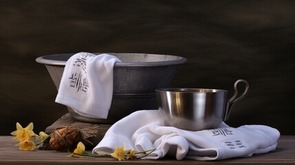 Symbols of foot washing during holy week basin towel and jug