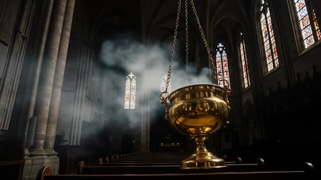 Incense Burning in Gothic Church: Mystical Atmosphere, Spiritual Ritual