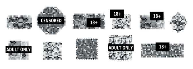 Censorship pixelated effect. Blurred pixels effect for adult and sensitive content. Censorship mosaic sign with blurred pixels. Collection of censorship bars for nudity and adult content. Vector