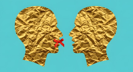 Two silhouette faces look at each other, one has a red cross over his mouth, censorship free speech