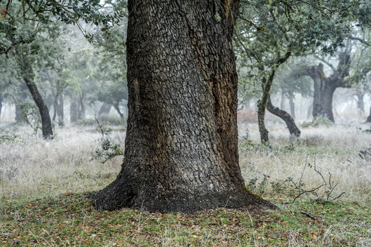 Ancient holm oak forest (Quercus ilex) in a foggy day with centenary old trees, Zamora, Spain.