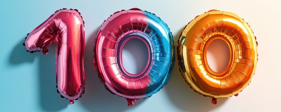 Colorful balloons shaped as the number 100, perfect for celebrations and special occasions.