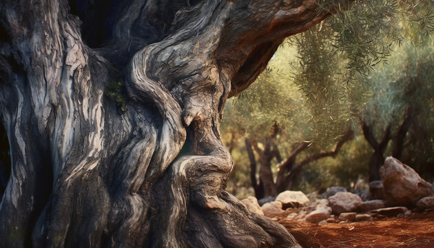 Recreation artistic of a trunk of a centenary olive in a olive grove. Illustration AI