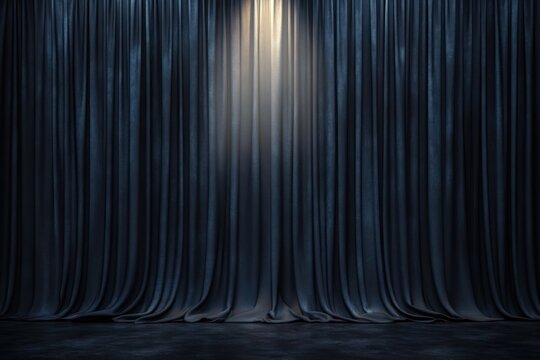 Empty dark blue theater curtains with single spotlight illuminating center, draped fabric and stage floor creating a moody, anticipatory atmosphere