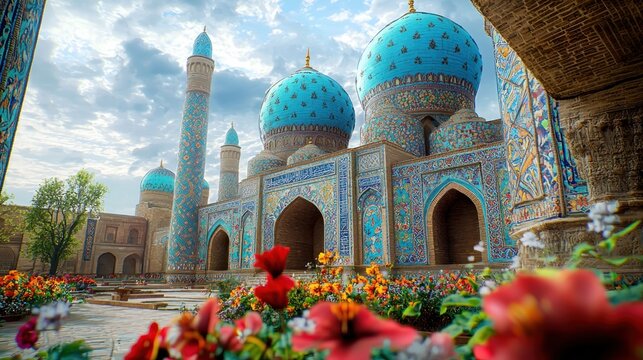 Central Asian Mosque, Blue Domes, Colorful Flowers, Sunny Day