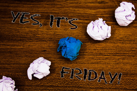 Word writing text Yes, It'S Friday Motivational Call. Business concept for having weekend Taking rest break Brown woody desktop four white crumpled paper balls central blue one.