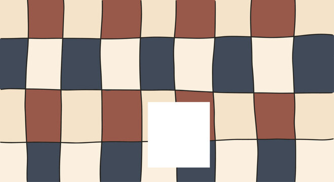 Hand-drawn checkerboard pattern in muted earth tones of blue, red, and beige, with a central white square for custom text.