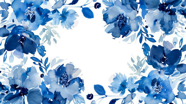 Serene blue floral watercolor frame with central white text area, isolated on a white background