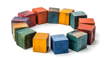 Gathering, centralization, of data and people, concept image. Circle of colorful wooden blocks representing unity of diverse elements. Isolated on pure white.