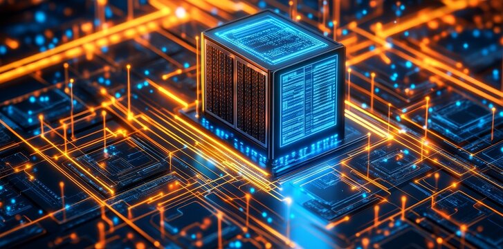 An isometric illustration of a centralized data hub, featuring interconnected nodes, circuits, and luminous lines, representing efficient data flow and robust network infrastructure