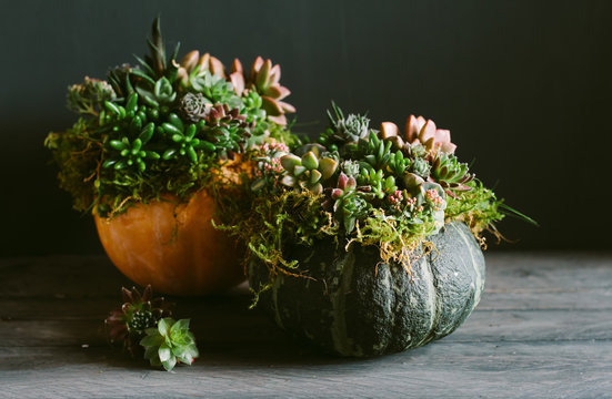 Close up of a cornucopia centrepiece filled with various autumn decorations