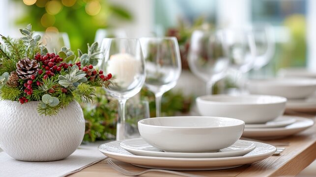Elegant Tablescape with White Porcelain Dinnerware and Greenery Centrepiece for a Festive Dining Experience