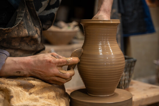 The woman's hands close up, the masterful studio of ceramics works with clay on a potter's wheel
