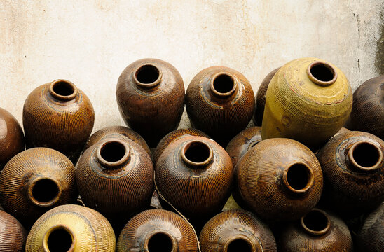 Traditional ceramic jars used to make Xuchang famous soy sauce stacked up against a  wall in Tongxiang's Wuzhen Scenic Area in Zhejiang province China.