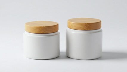 Two clean white ceramic jars with natural bamboo lids sit side-by-side on a light gray background, representing modern storage solutions.