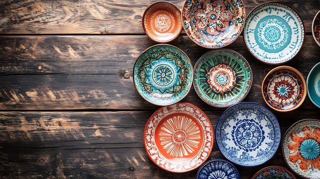Elegant arrangement of porcelain dinnerware and ceramic plates on a rustic wooden table vibrant colors intricate patterns no labelling no logo no human