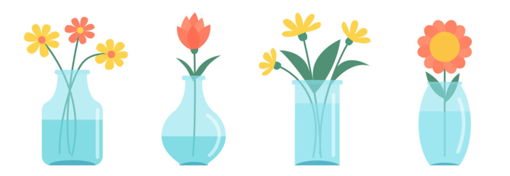 Flower in vase set line. Transparent glass vases with blue water. Different flowers. Cute colorful icon collection. Daisy Tulip Gerbera. Ceramic Pottery decoration. White background Flat design Vector