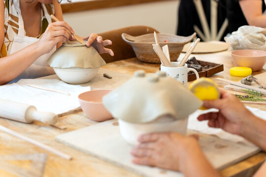 Hands creating pottery in ceramics workshop class