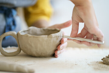 Professional ceramist at work using tools for creating handmade cup in studio, selective focus. Closeup of female potter hands shaping handcraft crockery in studio. Art and small business concept