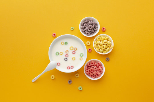 Milk pouring into bowl of cornflakes, slow motion. Healthy breakfast of cereal with milk, close up.