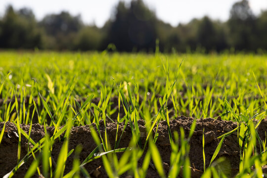 green shoots of frost-resistant wheat that was planted in winter, beautiful winter wheat, cereals in the autumn season before frost, sunny weather