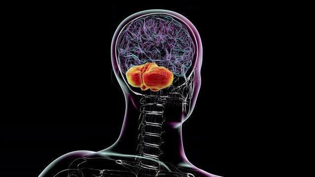 Rotating animation showing the anatomical structure of the human brain with highlighted cerebellum