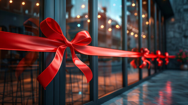 Elegant red ribbon on glass doors, symbolizing a ceremonial grand opening for a modern venue.
