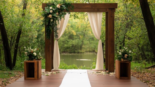 Bridge wedding ceremony setup with white chairs and a floral aisle runner, isolated, bridge wedding, luxurious natural setting