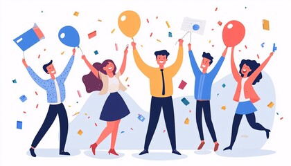 Five cheerful colleagues joyfully celebrate an achievement, holding balloons, confetti, and a certificate, symbolizing teamwork and success.
