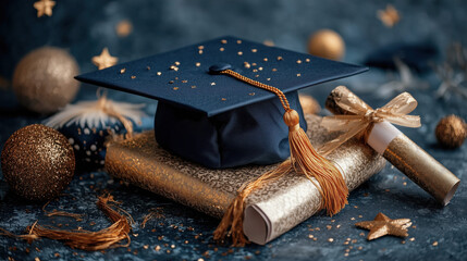 Golden graduation cap and diploma with starry embellishments for celebration. Graduation party concept background banner and website design template