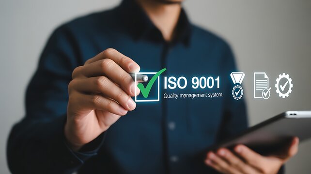Man touching ISO 9001 quality management system certification icons ISO 9001 quality control