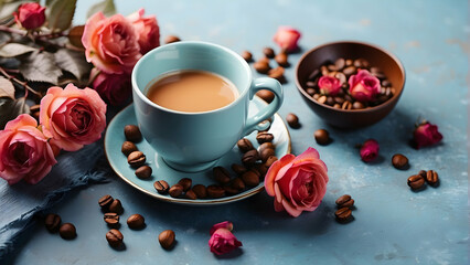 A soothing setup of a cerulean blue coffee cup surrounded by scattered coffee beans and vibrant roses