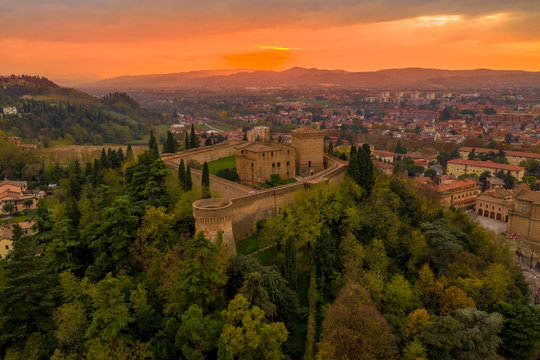 Sunset aerial panorama of Cesena in Emilia Romagna Italy near Forli and Rimini, with the medieval Malatestiana castle, Piazza del Popolo and Roman Catholic churches and cathedral on a winter afternoon